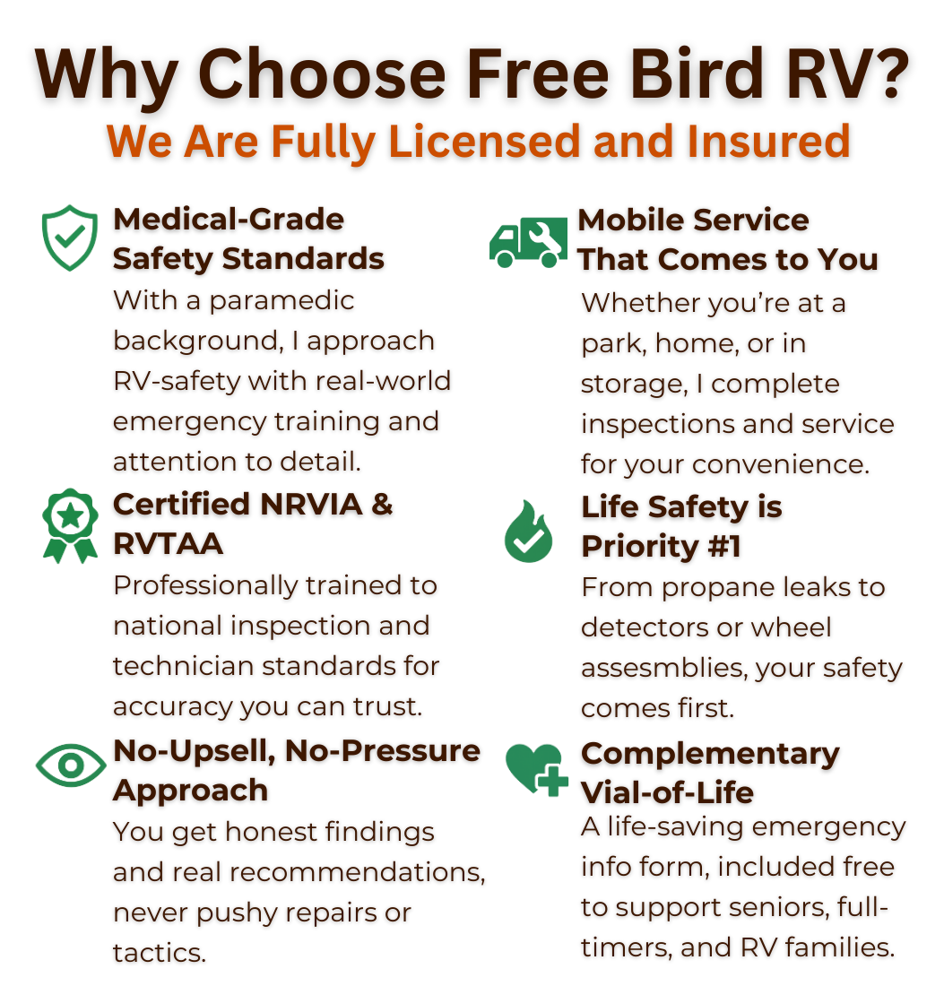 From full inspections to life safety audits to maintenance and personalized consulting, I help RV owners travel with confidence. As an NRVIA Inspector and an RVTAA Technician, I combine professional RV training with a medical background to keep you protected on every mile.